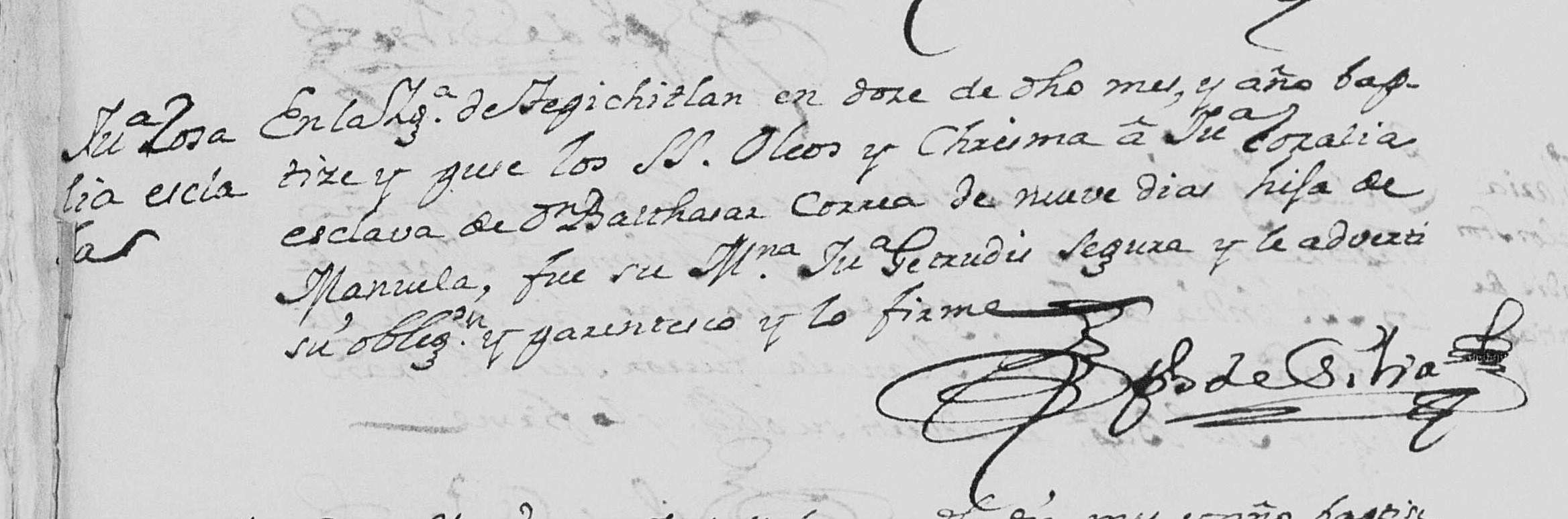 -En la yga. de Tepichitlan en dose de dho mes y ano baptize y puse lo SS. Oleos y Chrisma a Jsea Rozalia, esclava de Dn. Balthazar Correa de nueve dias hija de Manuela, fue su Mna. Ju Gertrudis Segura y le adverti su oblig.n y parentesco y lo firme (firma ilegible)-